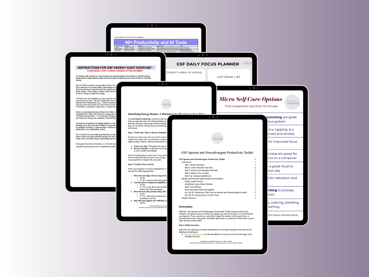 The GSF Spoonie and Neurodivergent Productivity Toolkit is a time and energy management system designed specifically for chronically ill and neurodivergent individuals. This digital toolkit includes curated tools, practical strategies, and supportive resources to help you build a sustainable productivity routine that works with your capacity, not against it. You might even find a few surprise bonuses along the way!