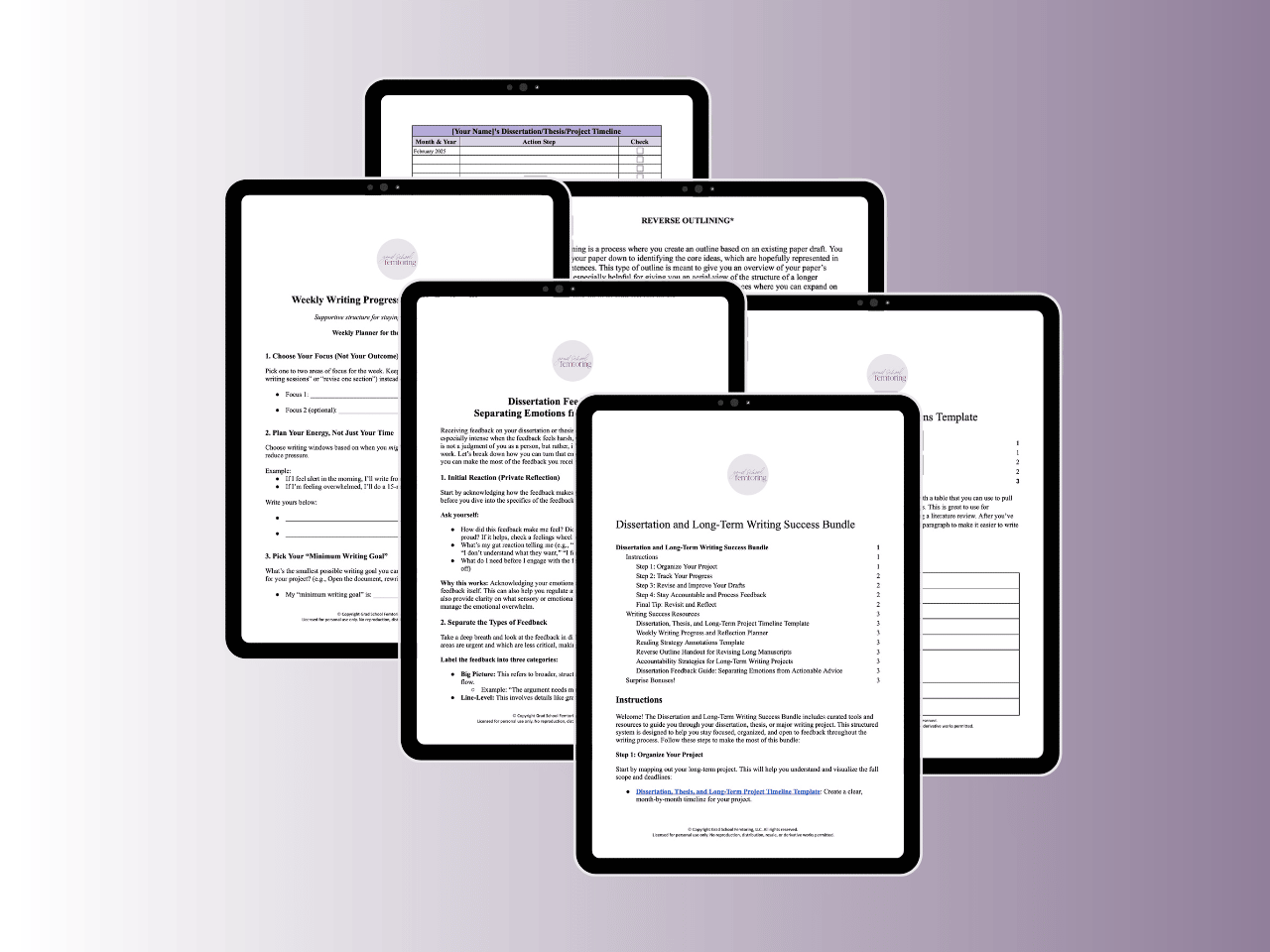 A structured digital toolkit designed to help you make consistent progress on your dissertation, thesis, or major writing project. This bundle includes practical templates, planning tools, and accountability strategies to support your focus, organization, and feedback process—plus a few helpful bonuses!
